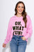 Bring the holiday cheer in full color with the "Oh What Fun" Lounge Sweatshirt. This cropped crewneck features bold green varsity-style lettering outlined in gold embroidery, all set against a playful pink background. Its relaxed fit makes it perfect for lounging, gift wrapping, or matching with your crew.