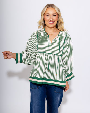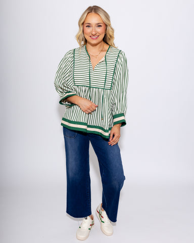 Elevate your everyday wardrobe with this hunter green ¾ sleeve top, featuring a bold stripe pattern and vibrant multicolor band detailing at the sl...
