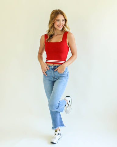 The Striped Square Neck GAMEDAY Top in Crimson features a knitted brami design with a wide shoulder strap and a square neckline, giving it a croppe...