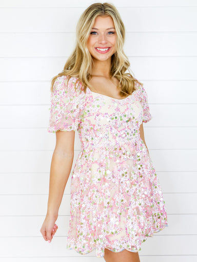 The cutest sparkly dress for the holidays! Details: Sequined sweetheart neckline dress with puffed sleeves and full skirt. Embroidered detailing o...
