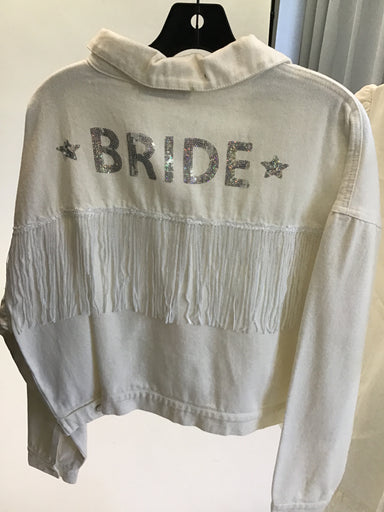 Stand out on your special day in our White Denim "Bride" Jacket with Fringe! Made with high-quality white denim, this jacket features the word "Bri...