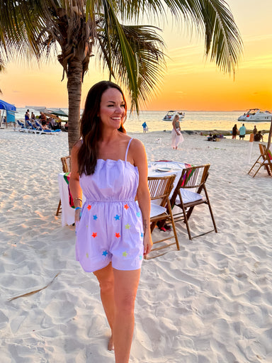 Starry sequin patch romper -Spaghetti straps -Pleated top -Elastic waist
