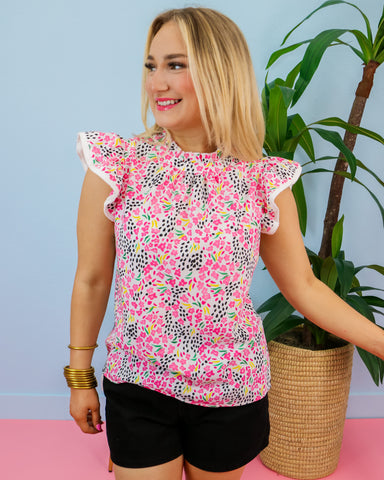 Abstract Print High Neck Flutter Sleeves Top