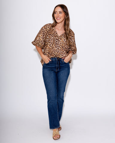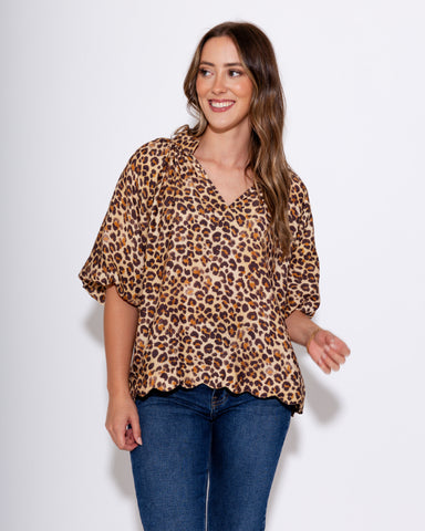 Softly bold and effortlessly chic, this latte-hued animal print top features a flattering V-neckline and statement bubble sleeves for a touch of vo...