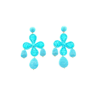 Enhance your style with the Cord and Rattan Quatrefoil Drop Earrings in Turquoise. Featuring a unique quatrefoil design crafted from durable ratta...