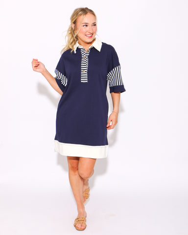 Introducing Carter! This new shift dress is a timeless wardrobe essential. Designed with a crisp point collar and short sleeves, it effortlessly bl...