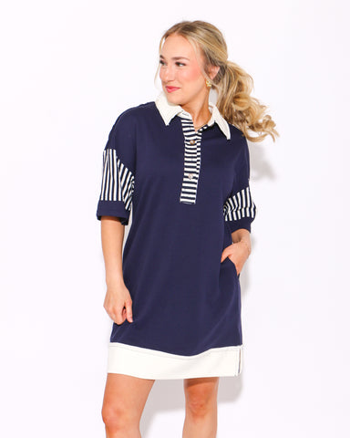 Get ready to turn heads in our Navy Striped Charm Mini Dress! Made from a solid jersey knit, this sleeveless pullover dress features a stylish cont...
