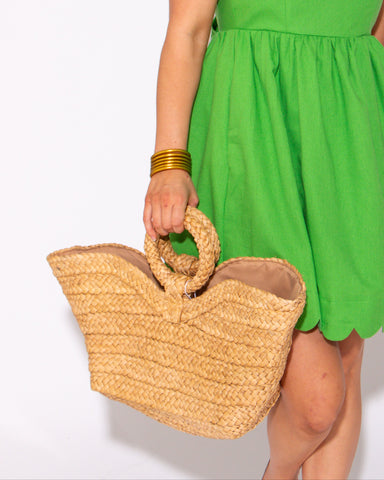 Elevate your summer style with the Edith Woven Design Straw Tote Bag. This natural beauty features elegant gold hardware and distinctive circle han...