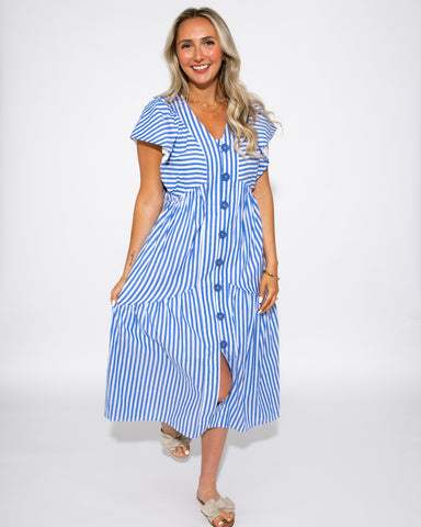 Indulge in playful sophistication with the Clementine Bloom Midi Dress. This multi-print dress features adjustable shoulder straps and a stripe con...