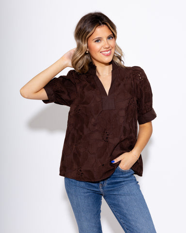 Elevate your wardrobe with our Brown Floral Embrace Split Neck Puff Sleeve Top! The delicate floral embroidery adds a touch of femininity to this t...