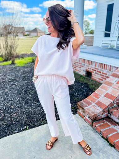 Experience the blissful comfort and style of our Linen Braid Bliss Two Piece Set! The cami blouse features adjustable straps, a sweetheart neckline...
