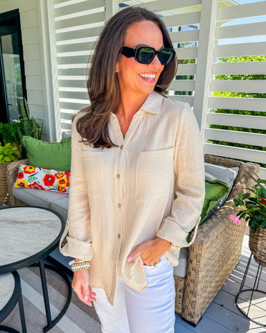 -Long Sleeve Double Gauze Button Down Shirt -Button-Down Front Closure -Optional Roll-Up Cuff -Round Shirttail Hem -Straight Collar -Chest Pockets...