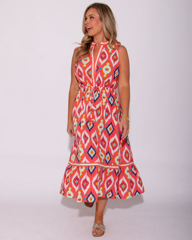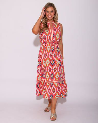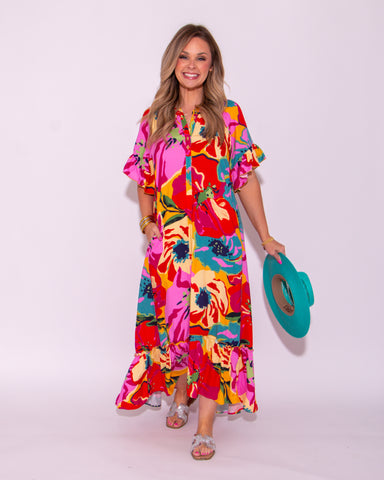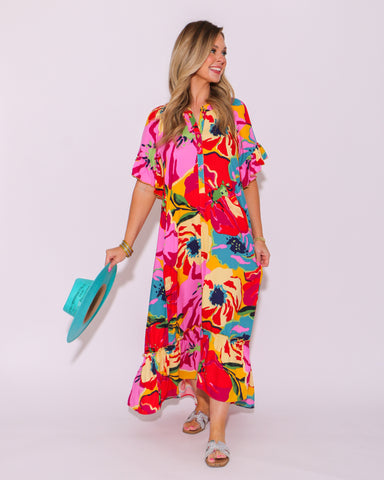 Bright, bold, and made to turn heads — this floral midi dress is everything you want for your next event (and then some). Featuring self-tie ribbon...