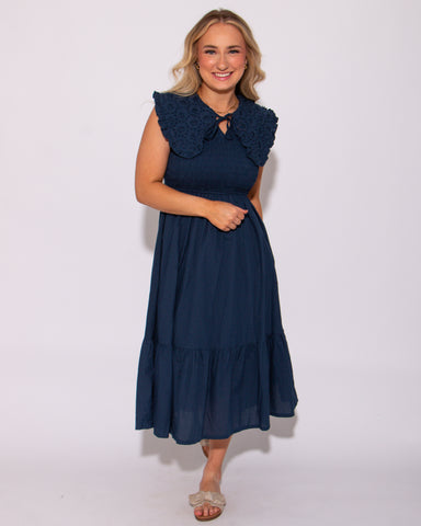 Elevate your wardrobe with our Navy Lace Embroidered Smocked Midi Dress! This A-Line dress features intricate lace embroidery and a smocked waist f...