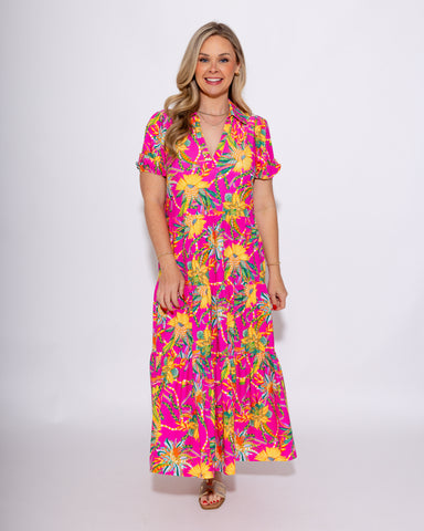 Bright blooms meet timeless black in the Peach Blossom Puff Sleeve Mini. Featuring a ruffled accent band collar with a flattering V-neckline, this ...