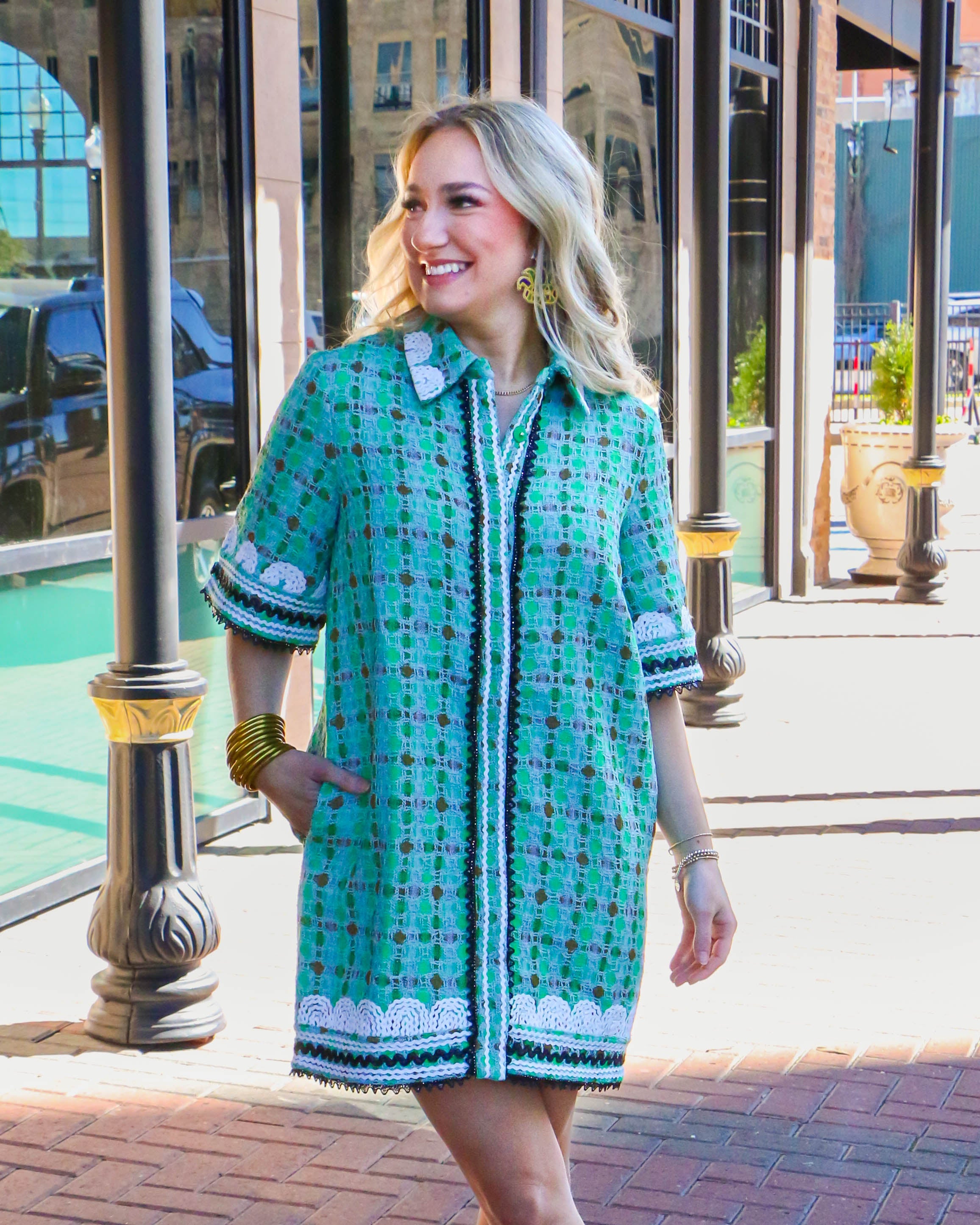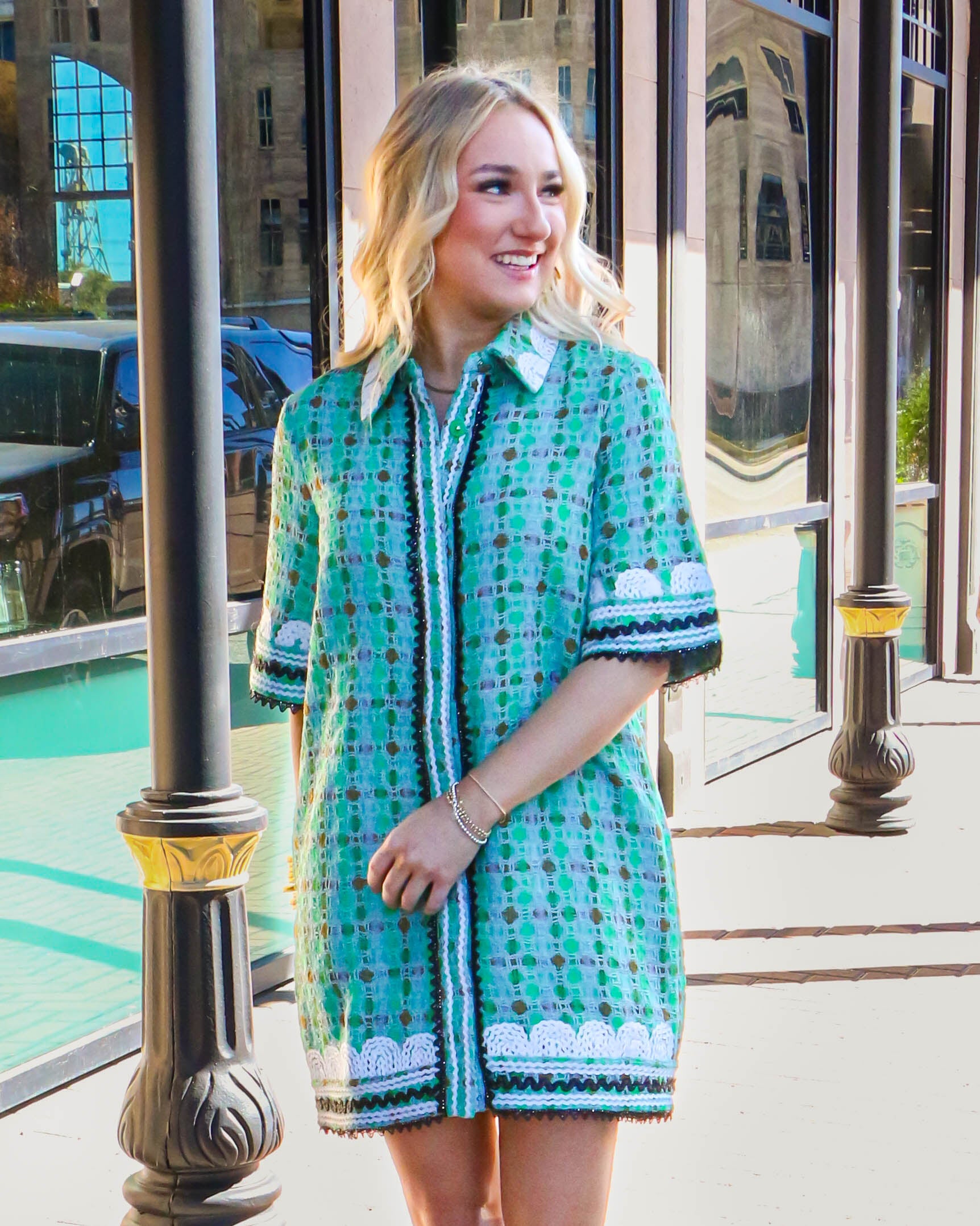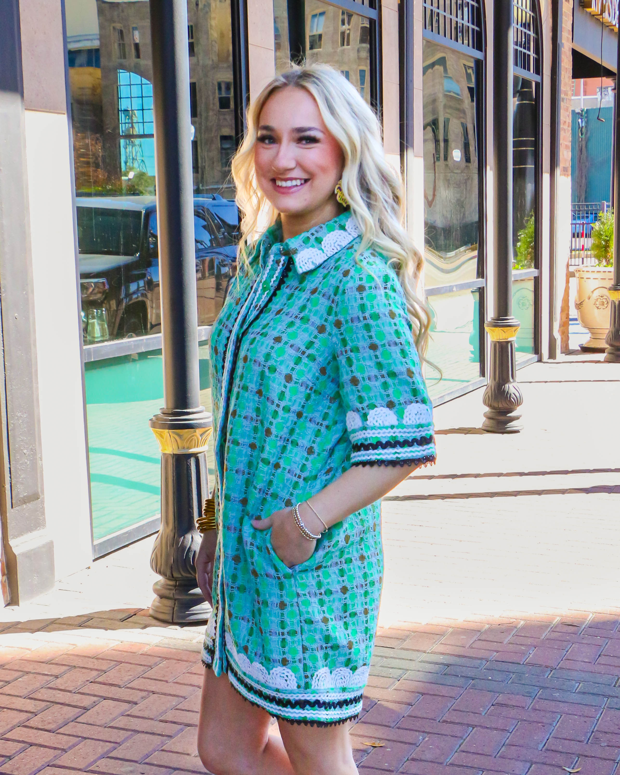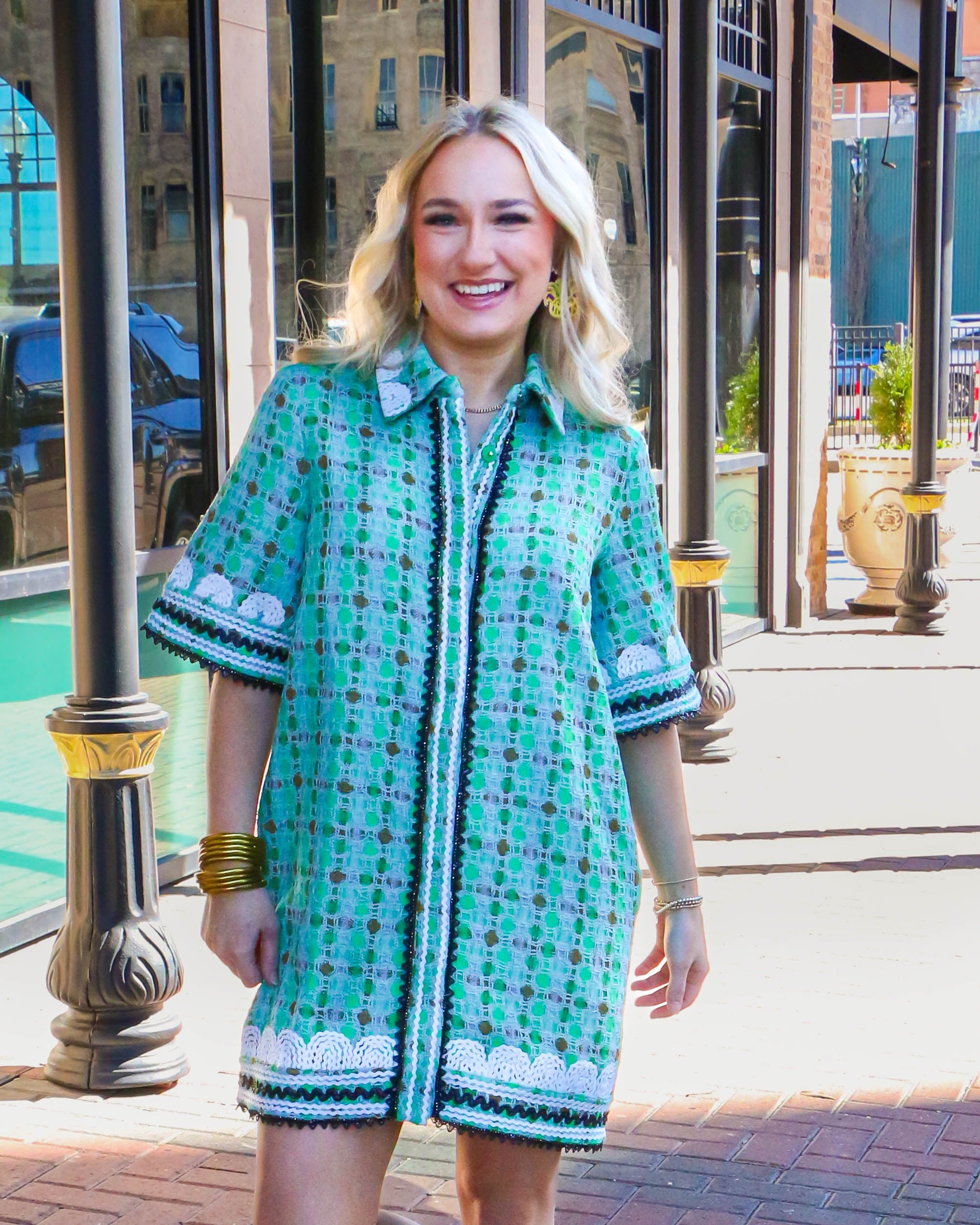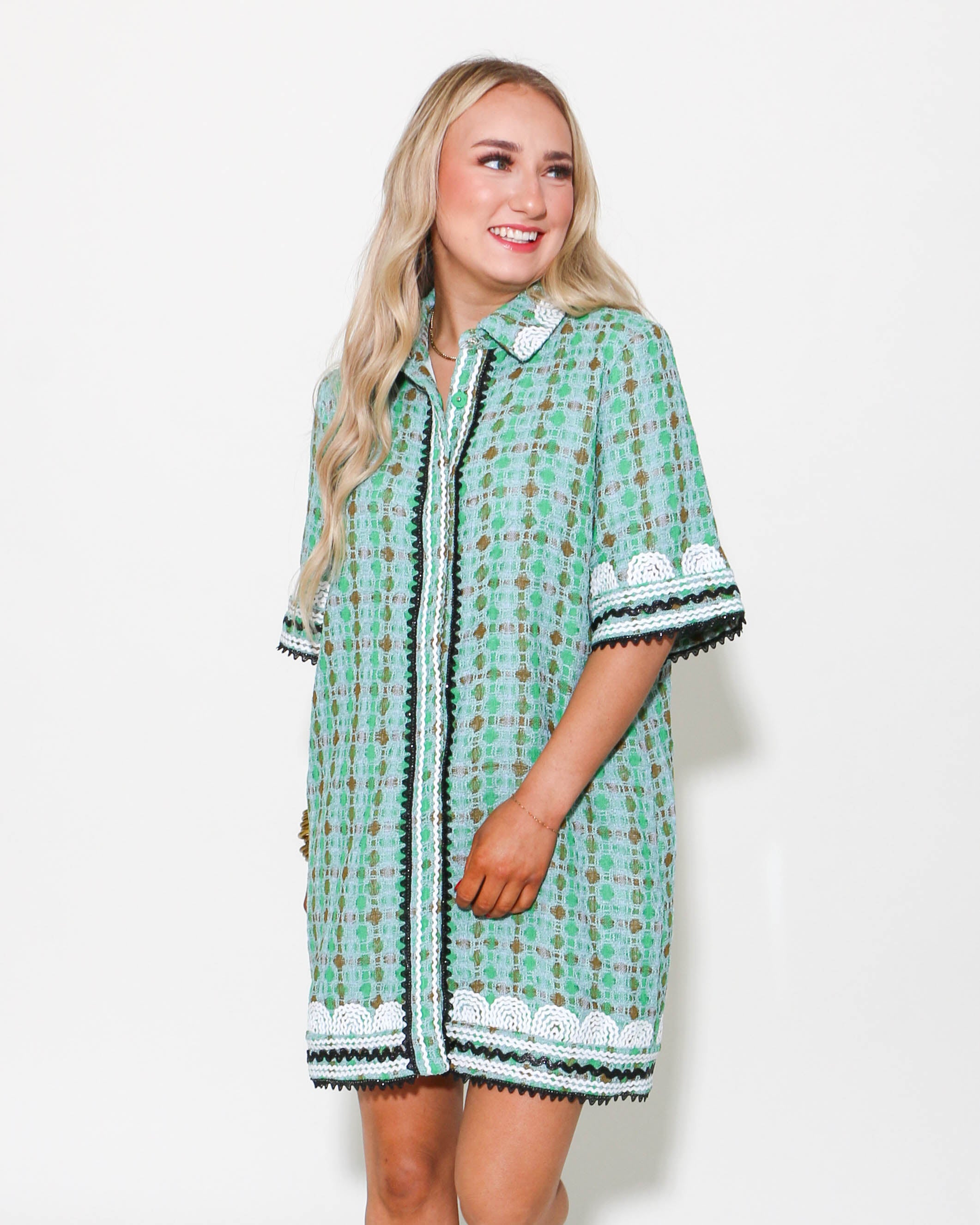 This Boucle Mini Shirt Dress With Ric Rac Trim is a stylish and modern dress for any occasion. It features a mini-length, shirt collar and all-over boucle fabric for an eye-catching look. The ric rac trim across the chest gives a chic and stylish contrast to the dress. It's perfect for the fashion-forward individual who wants to make a statement.