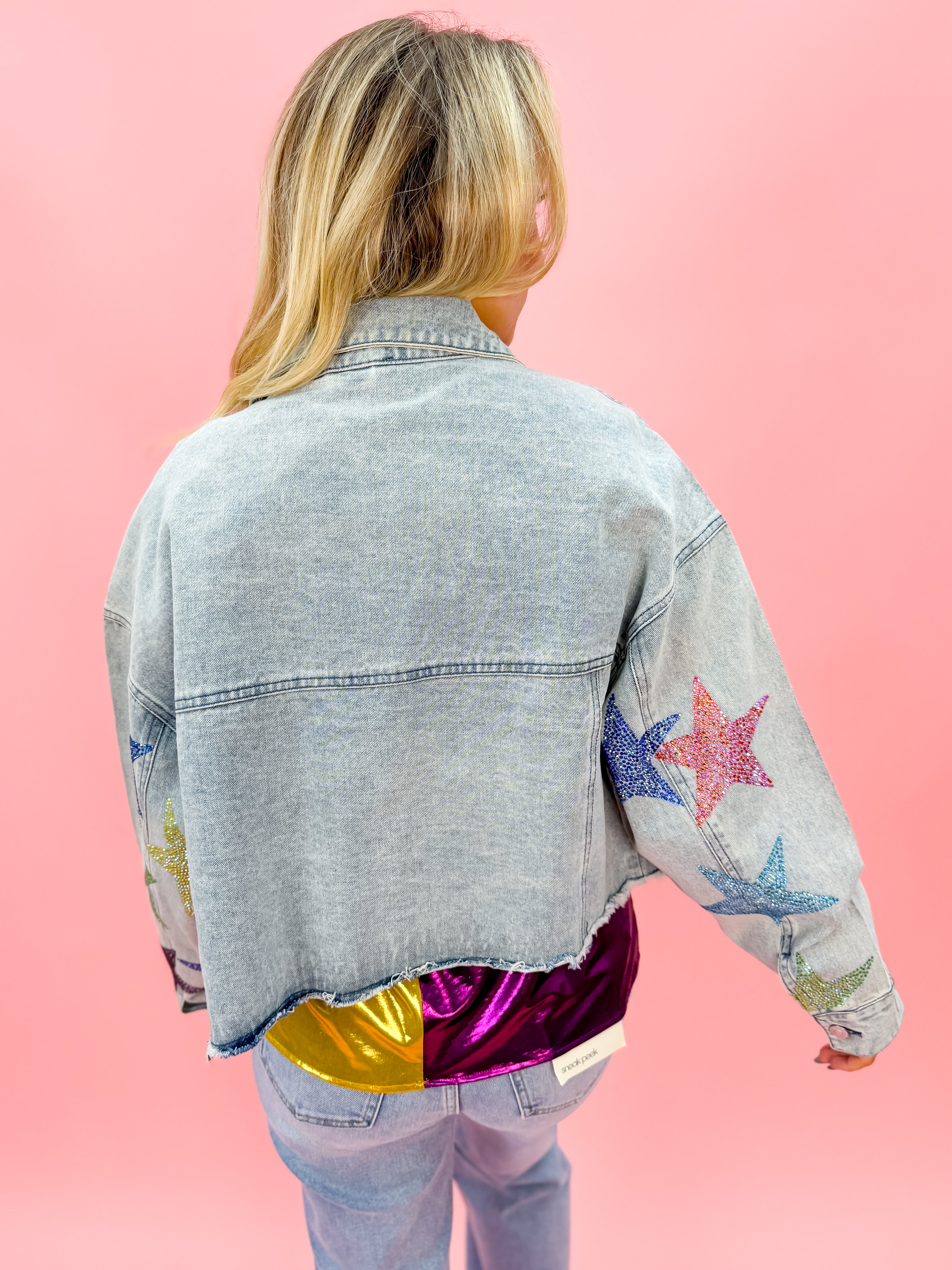 Introducing our Rhinestone Star Boxy Denim Jacket - a dazzling addition to your wardrobe. This collared jacket features long sleeves, a button-down closure, and pockets for both style and functionality. The rhinestone star embellishments add a touch of glamour, while the raw hem brings a hint of edge. Crafted from 100% cotton, it ensures comfort and durability. Elevate your fashion game with this standout denim jacket that seamlessly blends trend and individuality. Make a statement in style with the perfect combination of sparkle, comfort, and a touch of raw, edgy charm.