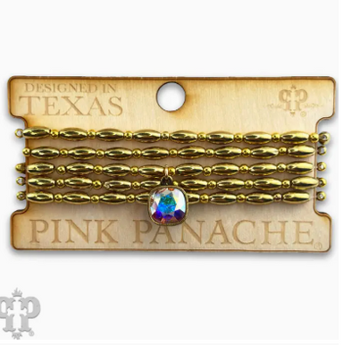 No reviews$ 22.00| /This bracelet set has five strands of rice shape beads with round gold tone beads in between. The charm is a 10 mm Austrian crystal in a setting cu...
