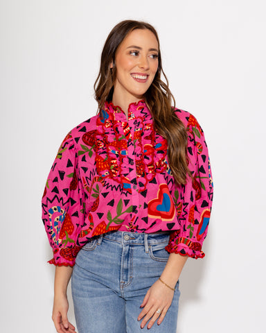 Embrace playful sophistication with this charming snakes top from Ivy Jane. Set against a vibrant hot pink background, the design features whimsica...