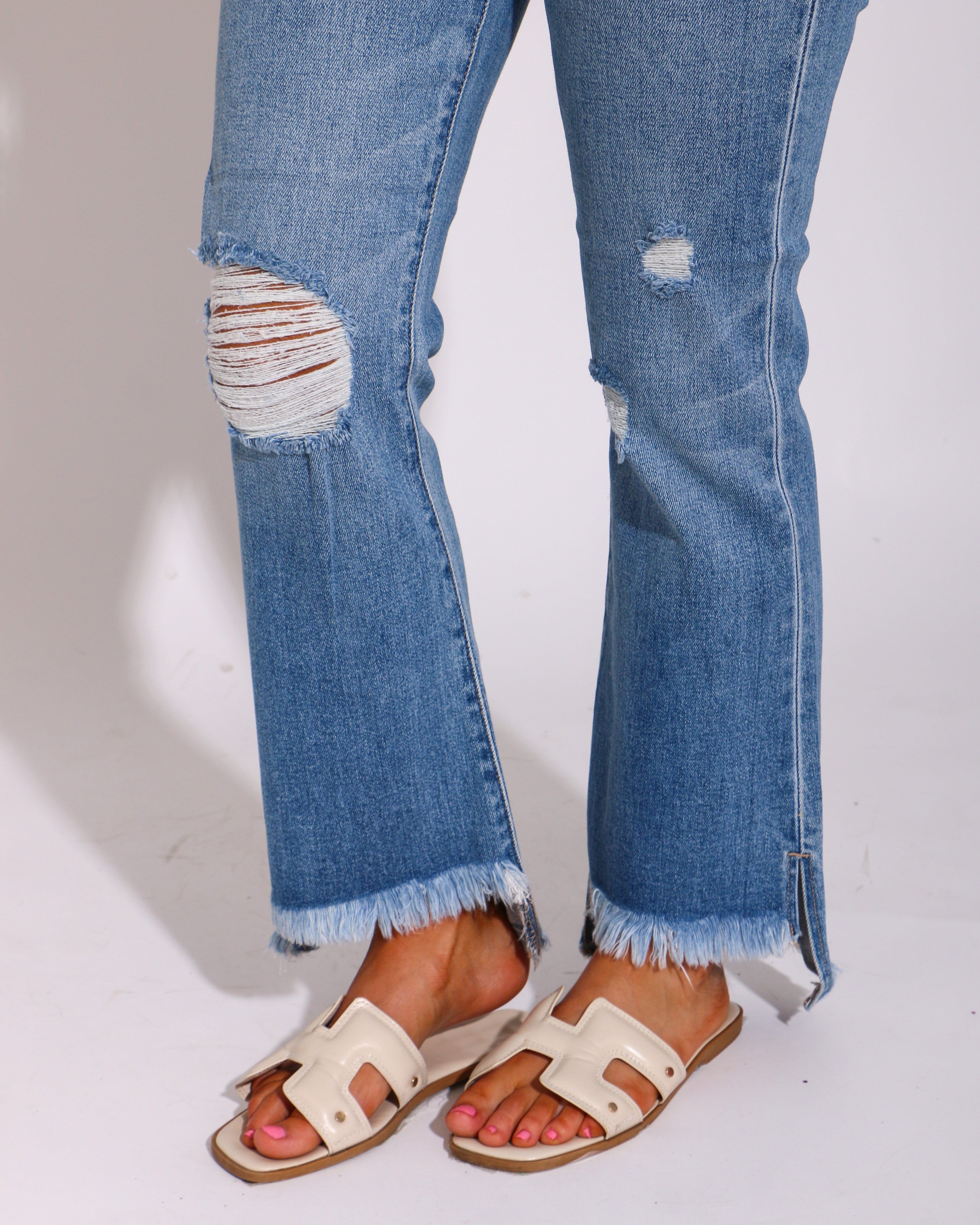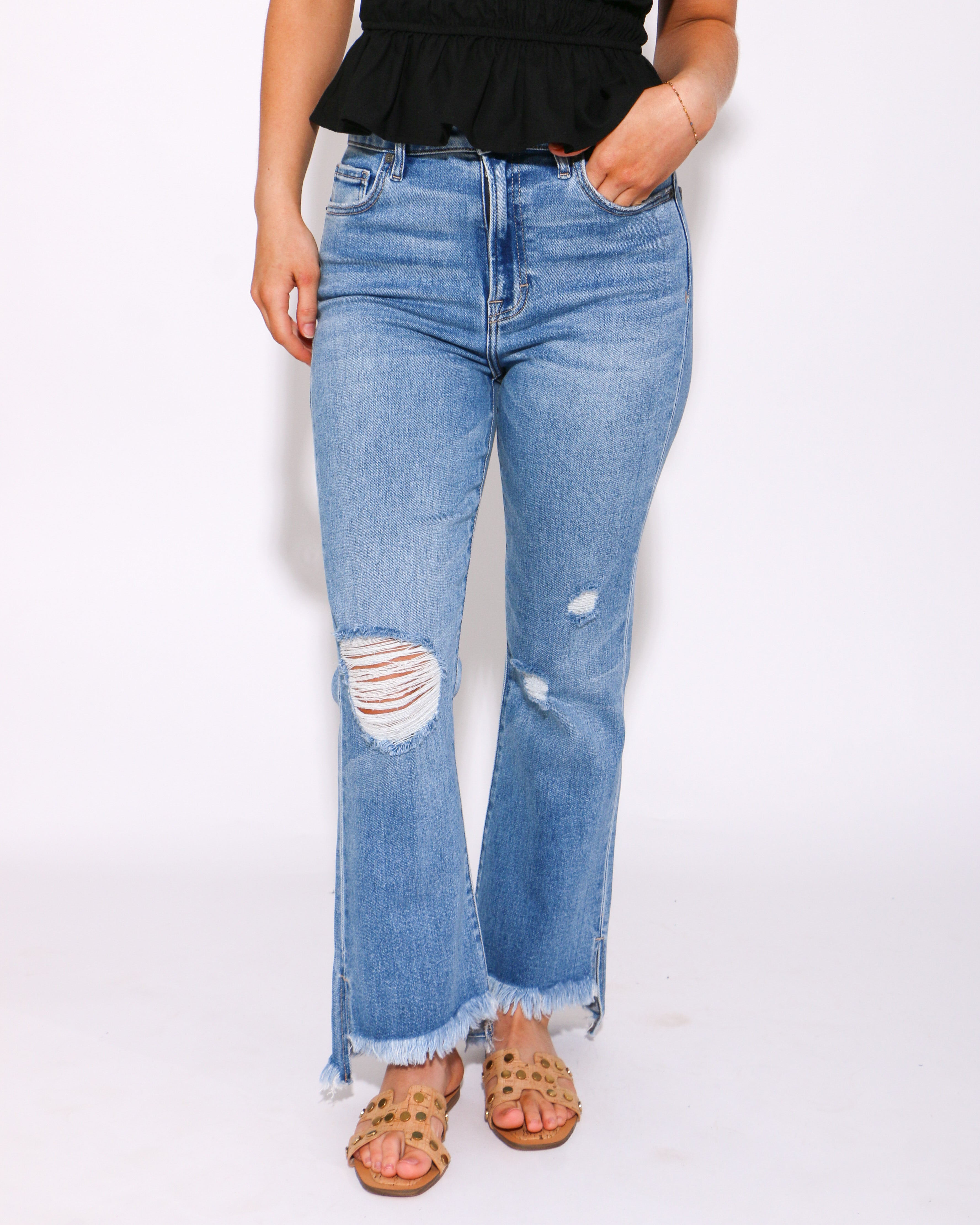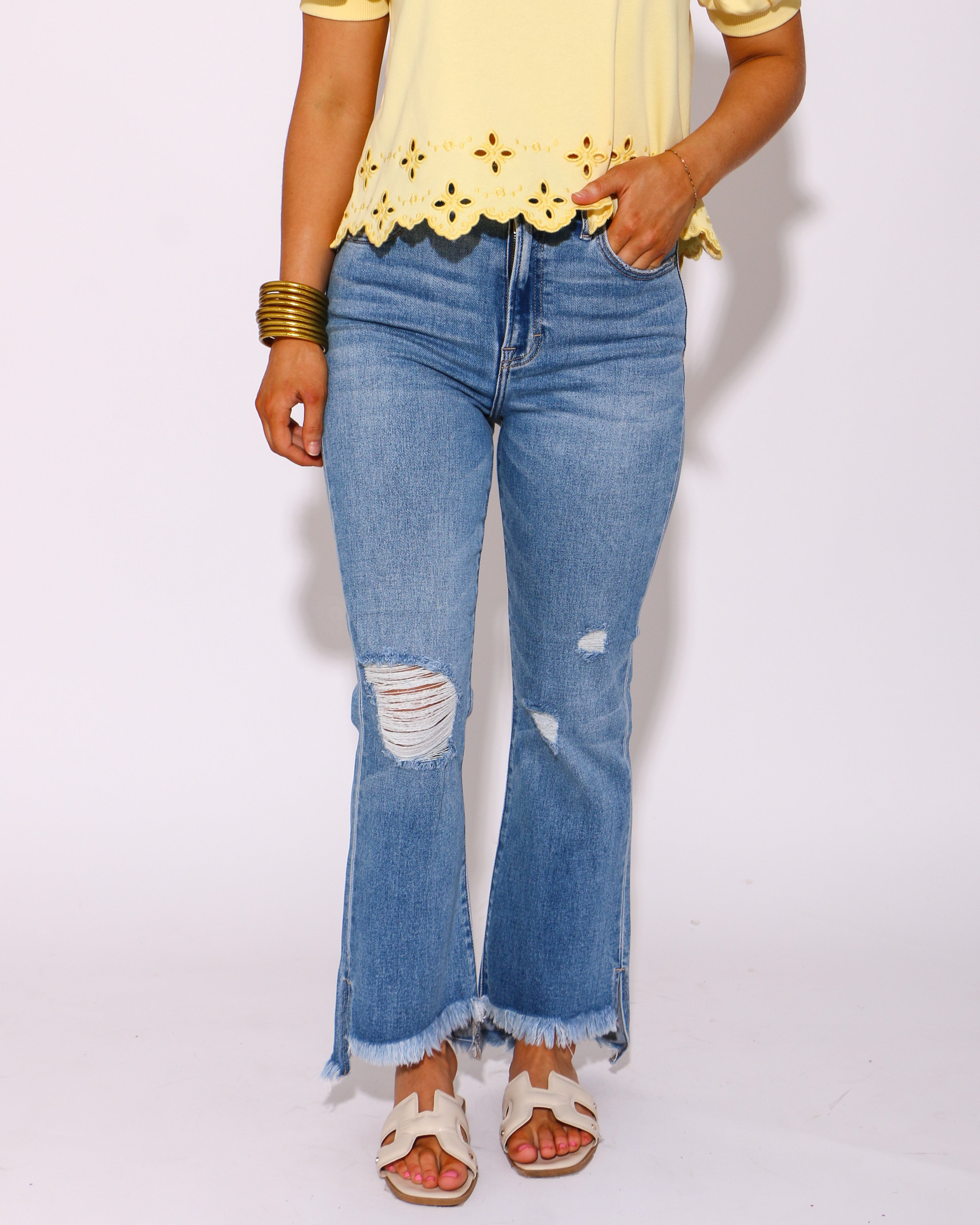Elevate your denim collection with our Happi Crop Flare jeans! Featuring a medium light wash and trendy slit knees, these cropped flares are perfect for any occasion. The unique step hem adds a touch of style while elongating your legs. Upgrade your look with the must-have Happi Crop Flare jeans today!