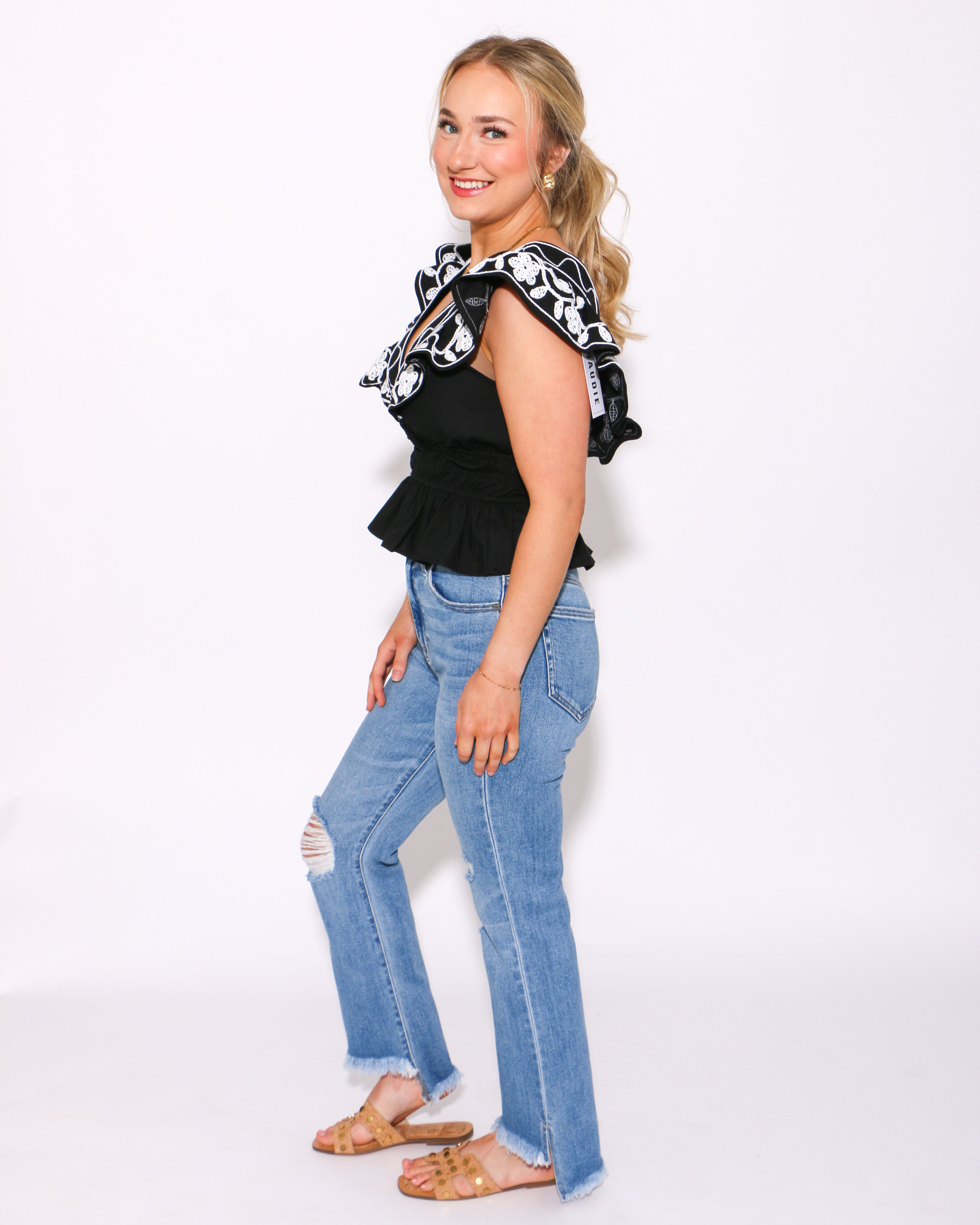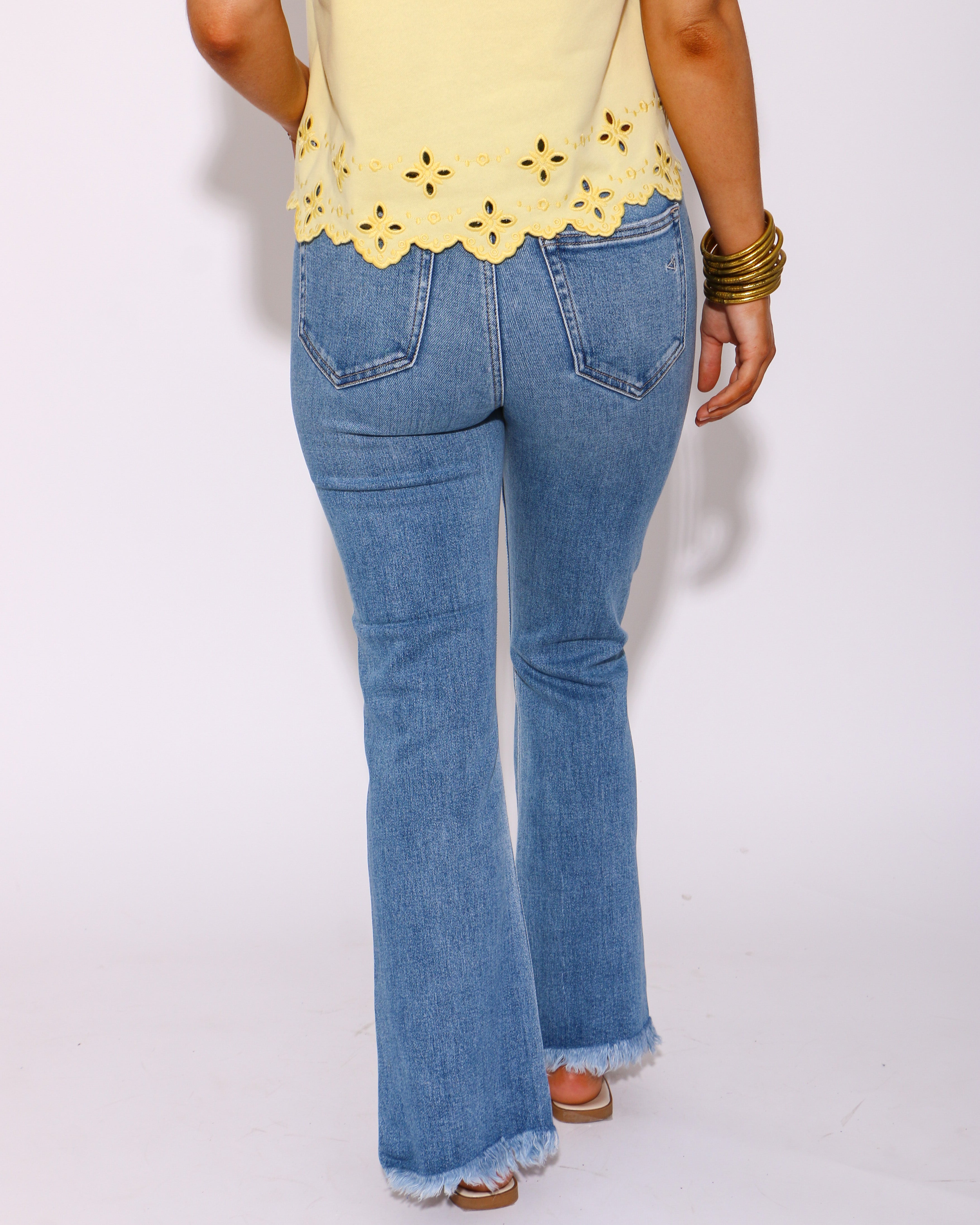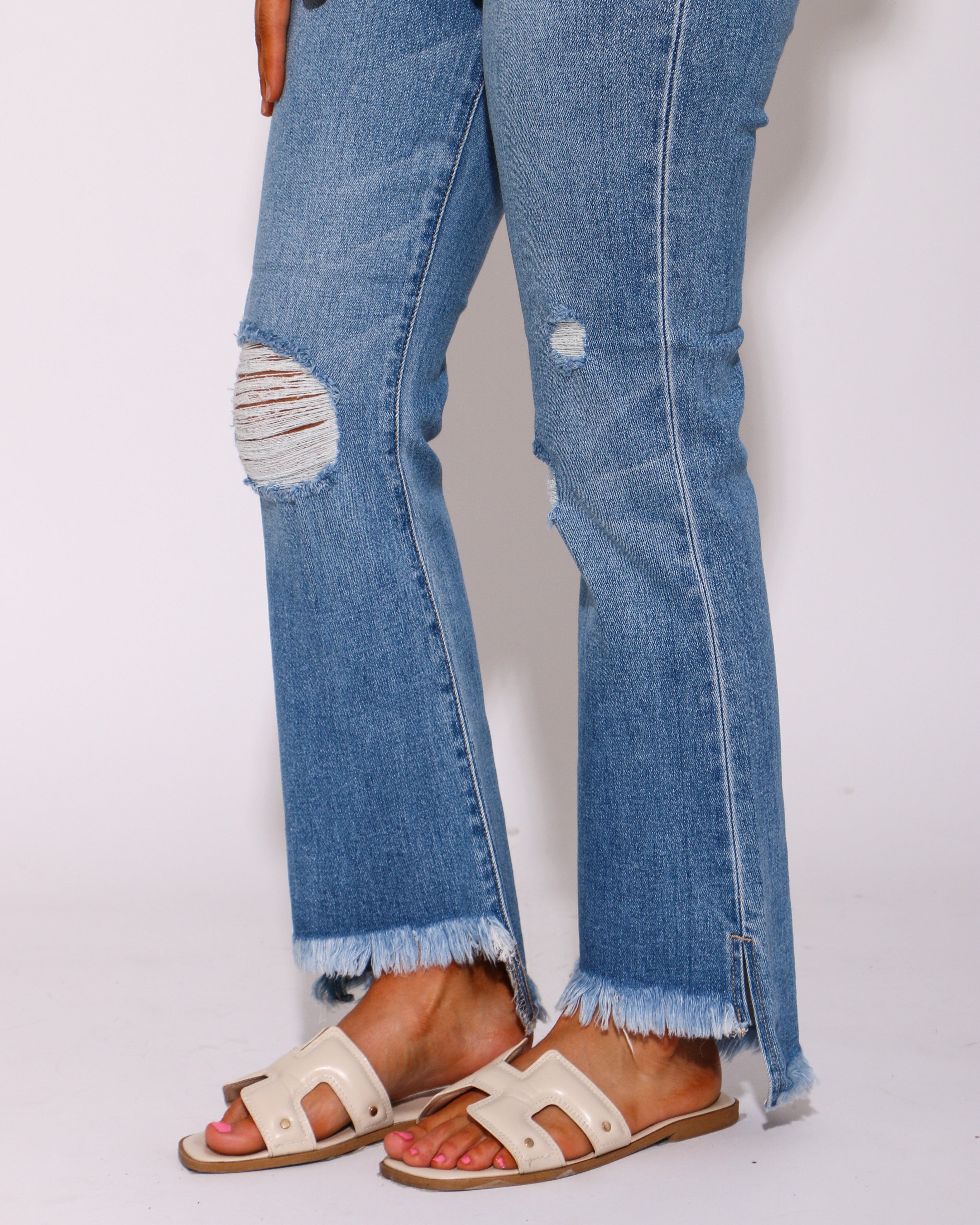 Elevate your denim collection with our Happi Crop Flare jeans! Featuring a medium light wash and trendy slit knees, these cropped flares are perfect for any occasion. The unique step hem adds a touch of style while elongating your legs. Upgrade your look with the must-have Happi Crop Flare jeans today!