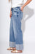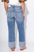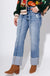 These medium wash jeans feature a unique uneven front waistband that brings distinct character to your look. Detailed with a cut seam and raw hem line running down the front, finishing in a stylish cuffed raw hem, they offer a trendy edge. Crafted from soft stretch denim, they provide lasting comfort while maintaining their shape wear after wear. Perfect for all-day wear with a fashionable twist.
