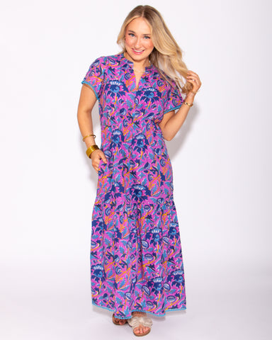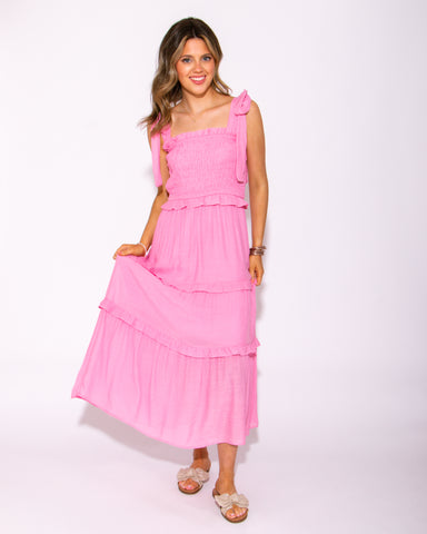 Feminine, flowy, and effortlessly chic—the Pink Floral Tiered Midi Dress is a seasonal standout. Set against a rich forest green background, delica...
