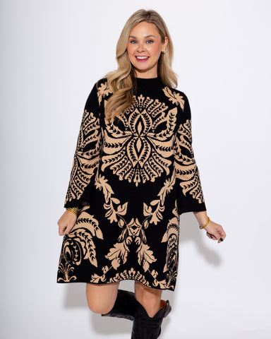 Elevate your wardrobe with this Two-Tone Abstract Print Sweater Dress. Crafted in a soft knit, it features a chic mock neck and a flattering A-line...