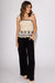 Softly structured and full of feminine detail, this linen-cotton blend top features intricate rolled embroidery throughout for a touch of artisanal charm. The stretch smocked bodice offers a flattering fit, while double ruffle elastic straps and a square neckline create a sweet, romantic silhouette. Finished with a ruffle hem for extra flair, it’s a perfect warm-weather piece to pair with your favorite high-rise denim.