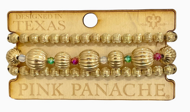 This bracelet set has three strands of gold tone fluted beads in different sizes. There are green, red and white beads in between the larger bead s...