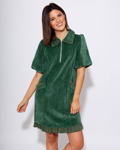 Elevate your wardrobe with this hunter green quarter zip mini dress featuring charming ruffle pocket details. Its playful yet polished design pairs...