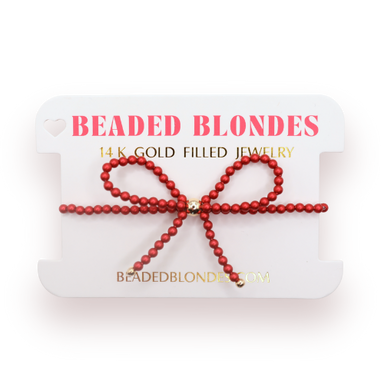 Red Pearl Beaded Bow Bracelet perfect for the holiday season and beyond. • Synthetic Pearls + 14 K gold filled & elastic string • Handstrung...