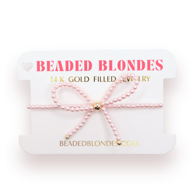 Pink Pearl Beaded Bow Bracelet perfect for the holiday season and beyond. • Synthetic Pearls + 14 K gold filled & elastic string • Handstrun...