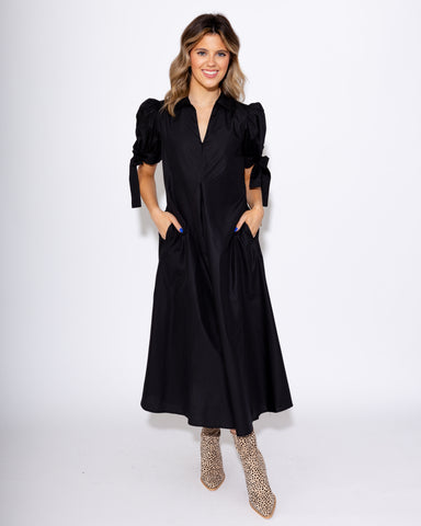 Elevate your style with this Black Tie-Sleeve Midi Dress, featuring a sophisticated collared design and a flattering split neck. The puff sleeves a...