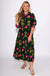 Feminine, flowy, and effortlessly chic—the Pink Floral Tiered Midi Dress is a seasonal standout. Set against a rich forest green background, delicate pink florals pop beautifully throughout the dress. Featuring a round neckline with subtle ruffle trim, a partial button front with gold-tone buttons, 3/4-length sleeves, and contrast trim details, this tiered A-line midi dress is designed for timeless elegance. Lightweight and unlined, it pairs perfectly with heels, boots, or flats for brunches, garden parties, or casual evening outings.