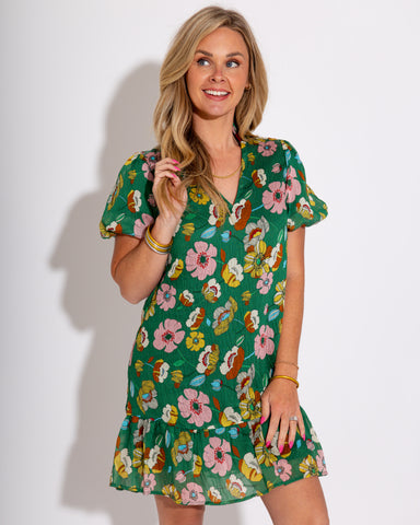 Bring fresh energy to your wardrobe with this vibrant mini dress featuring puff sleeves and a playful split neckline. The rich green background bea...