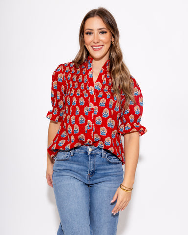 Make a statement in this vibrant button-up blouse featuring a red background adorned with floral prints in blue stems and pale orange petals, all a...