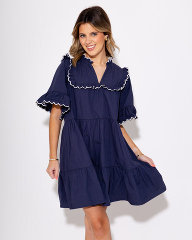 Chic Meets Sweet in This Navy Mini DressStep into effortless charm with this navy mini dress, featuring crisp white contrast scalloped stitching th...