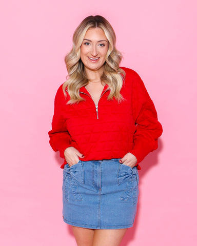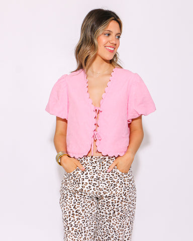 Your game day just got cuter. This cropped twill top brings the energy with a playful bow print, football-inspired corded details, and a sporty-chi...