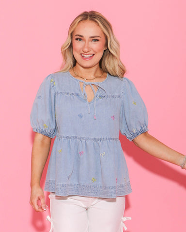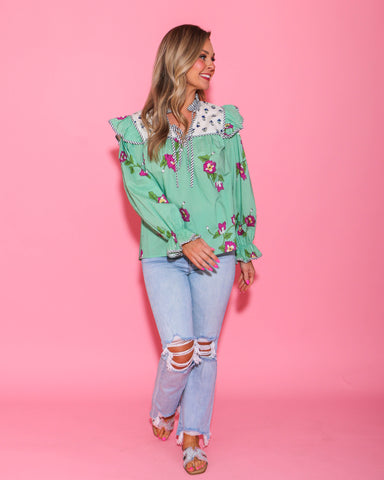 Romantic and timeless, this long sleeve puff top is blooming with delicate charm. Set against an ecru background, the dainty multicolor floral prin...