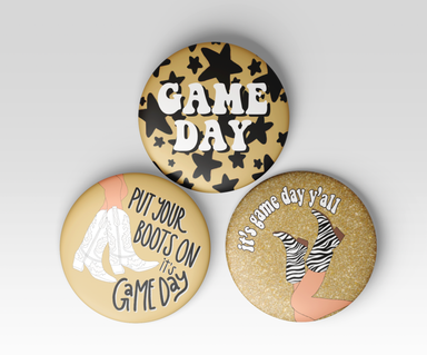 INCH BLACK AND GOLD GAME DAY TAILGATE PINBACK BUTTONS ★ PUT YOUR BOOTS ON ★ GAME DAY STARS ★ IT'S GAME DAY Y'ALL