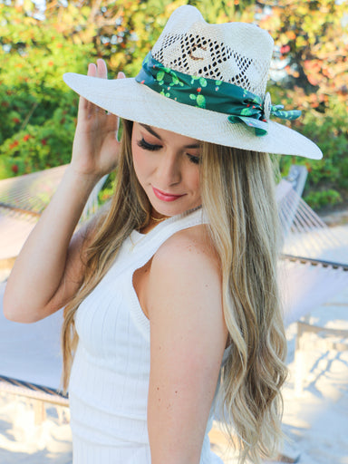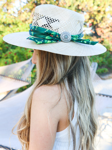 Elevate your sunny-day style with this stunning cream-colored wide brim hat, designed to keep you both chic and shaded. Delicately tied around the ...