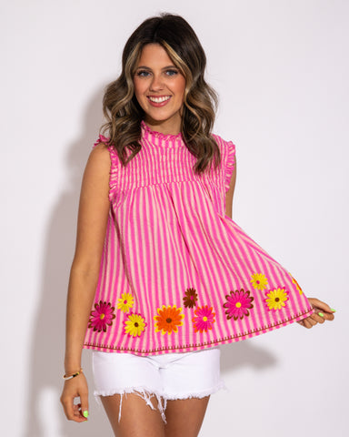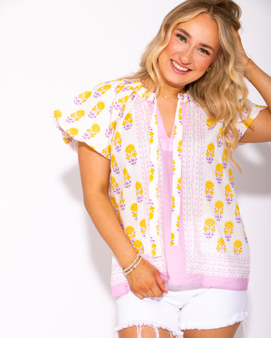 The Ivy Jane Tucked Bib Top features a rich grape-colored background accented with bright yet subtle floral pops, creating a fresh and elegant look...