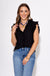Elevate your everyday style with this elegant black top featuring delicate black embroidered floral bouquets. The airy fabric and breezy silhouette ensure all-day comfort, while charming ruffle details trim the cap sleeves, V-neckline, and button-up front, adding subtle romantic flair. Lightweight and effortlessly chic, this top pairs perfectly with everything from jeans to skirts for a versatile wardrobe staple.