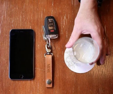 Natural Leather Key ring and snapped closure Silver hardware Dimensions: 3h x .75w Please note: Hot Stamp and Traditional Hot Stamp do not sh...