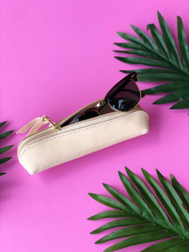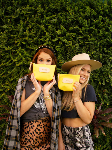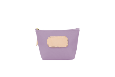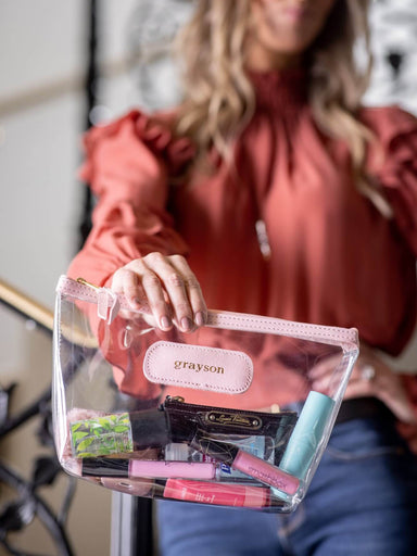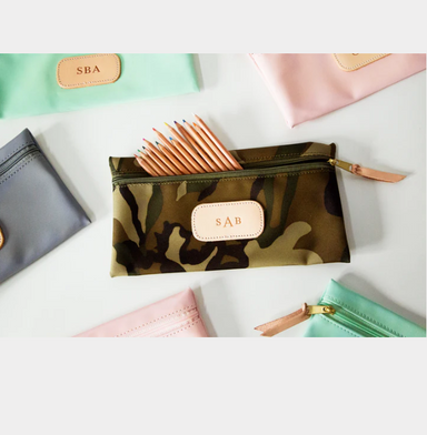 Vinyl Coated Canvas with Natural Leather details Zippered closure with brass hardware Dimensions: 6h x 11w x 1d Please choose one Hot Stamp S...