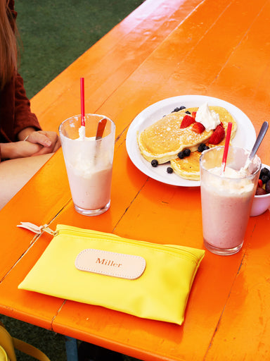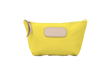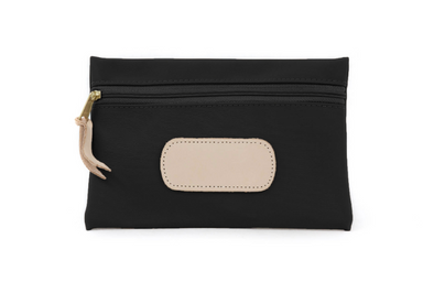 Vinyl Coated Canvas with Natural Leather details Zippered closure with brass hardware Dimensions: 6h x 9w x 1d Please choose one Hot Stamp Sty...