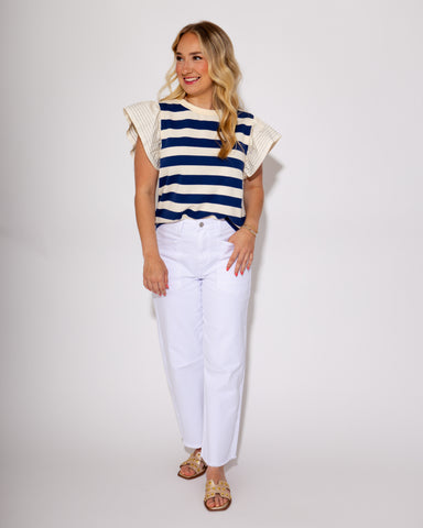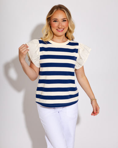 Elevate your casual wardrobe with our Stripe and Chill Top in Blue! This oversized top features a round neck, drop shoulder, and short sleeves for ...