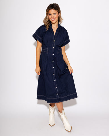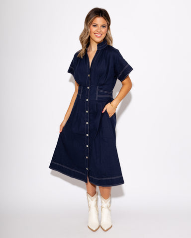 Elevate your wardrobe with this sophisticated navy button-down midi dress. The cinched waist with contrast white stitching creates a flattering sil...
