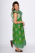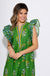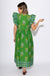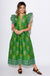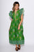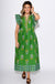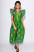 Timeless elegance meets effortless style in this pullover midi dress, set against a rich green background that beautifully showcases a framed floral border in pale blue and light gold hues. Featuring a multicolor band-accented split neckline and graceful flutter sleeves, this dress combines feminine details with practical side pockets. Refined and comfortable, it’s a versatile choice for both polished daytime looks and special occasions.